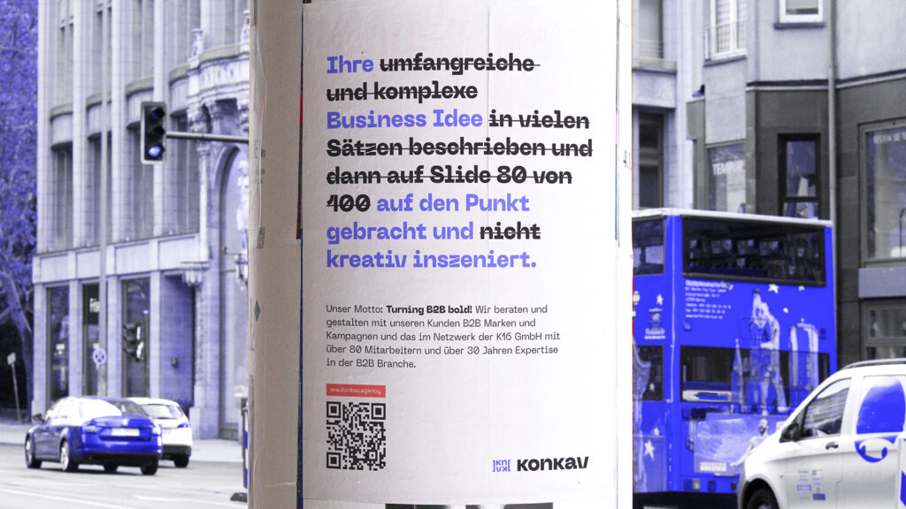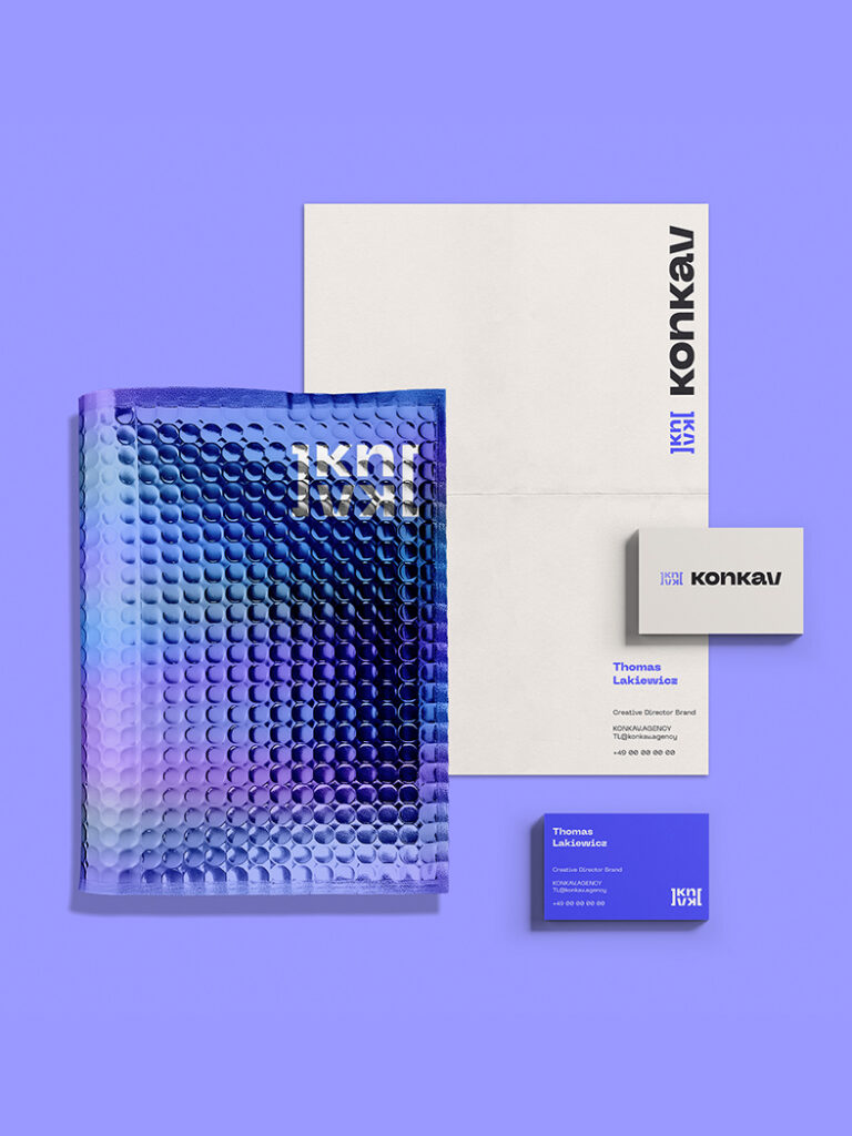 Solution ⸺ The brand Konkav was developed—named after the concave lens that concentrates and disperses light. This concept is reflected in the motto “Turning B2B bold”, symbolizing the focused delivery and creativeamplification of messages. The visual identity blends contemporary minimalism with seriousness and a clear B2B focus, resulting in a strong, flexible, and trustworthy brand presence.